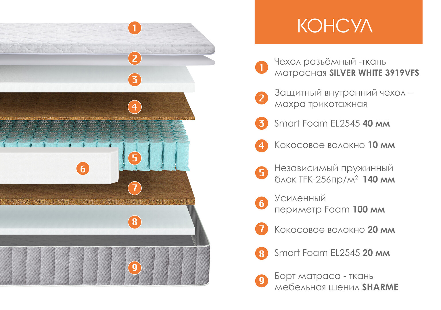 Матрас «Консул» — ортопедическое изделие для сна и отдыха, изготовлено на основе блока независимых пружин TFK (256 пружин на м²) для правильной поддержки позвоночника, а также кокосовой койры для жёсткости и пенополиуретана (Orto Soft), добавляющего комфорт. Одна сторона матраса — средней жёсткости, вторая — с дополнительным слоем кокосовой койры повышенной жёсткости. В модели по всему периметру используется короб из пенополиуретана шириной 100 мм, что повышает прочность и препятствует деформации края боковины.