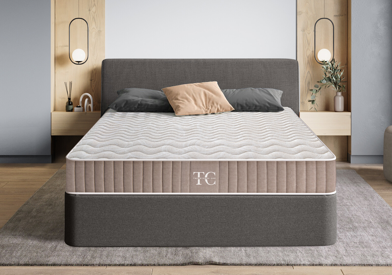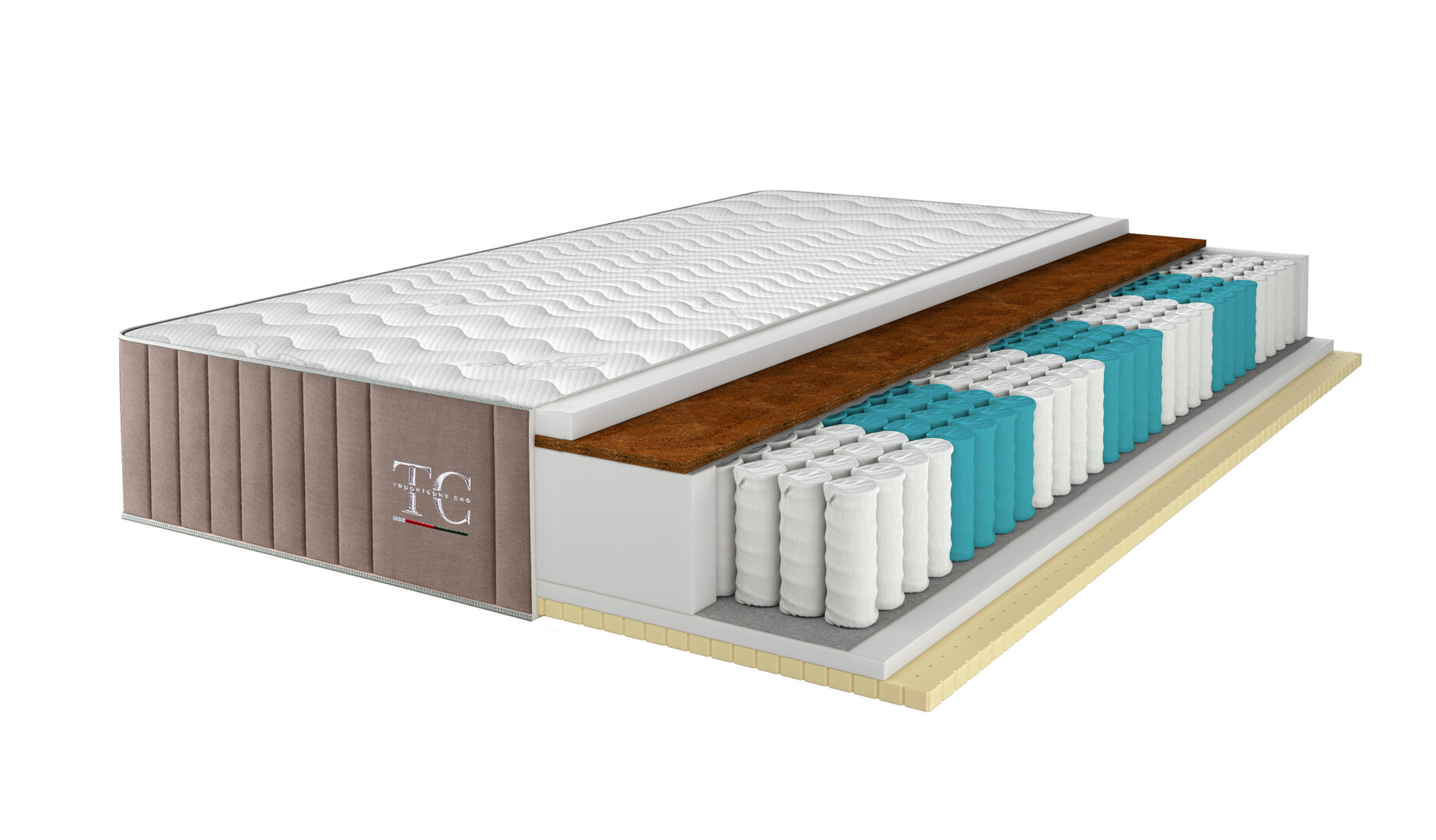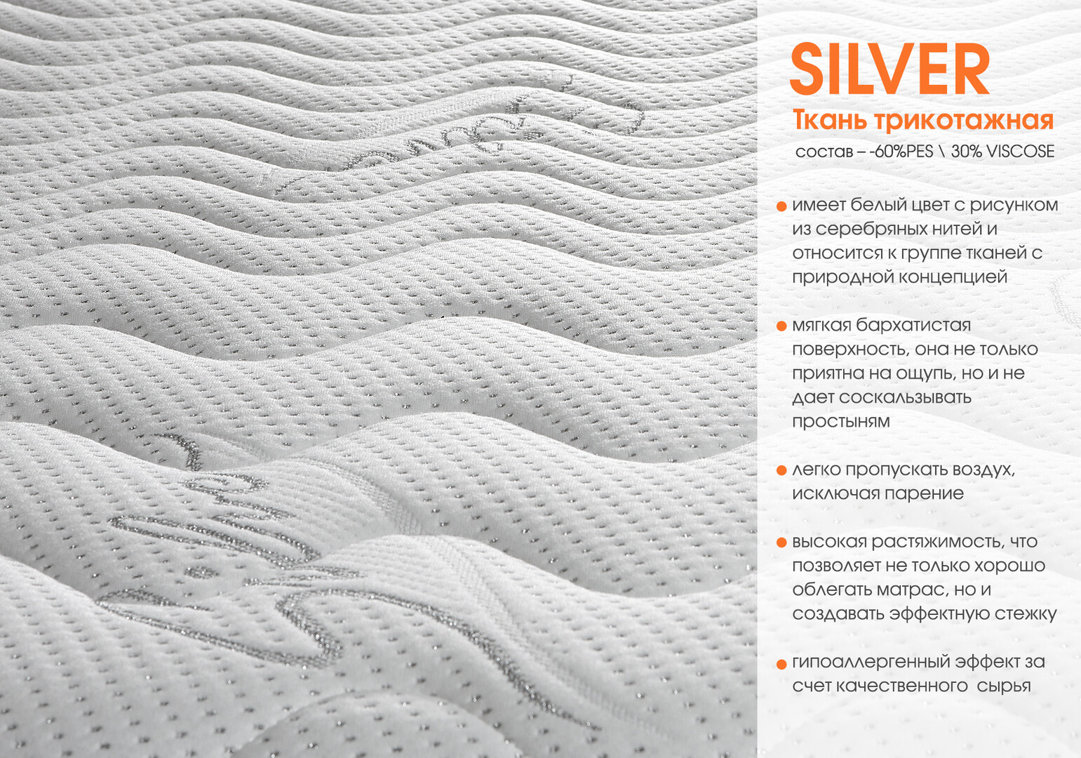 Основной чехол матраса: верх матраса — разъёмный, на молнии, из трикотажной ткани Silver (63 % полиэстер, 37 % вискоза; разрешена стирка). Борт матраса — мебельная ткань микровелюр, коллекция Мarino от компании «БЕЛКРАФТ».