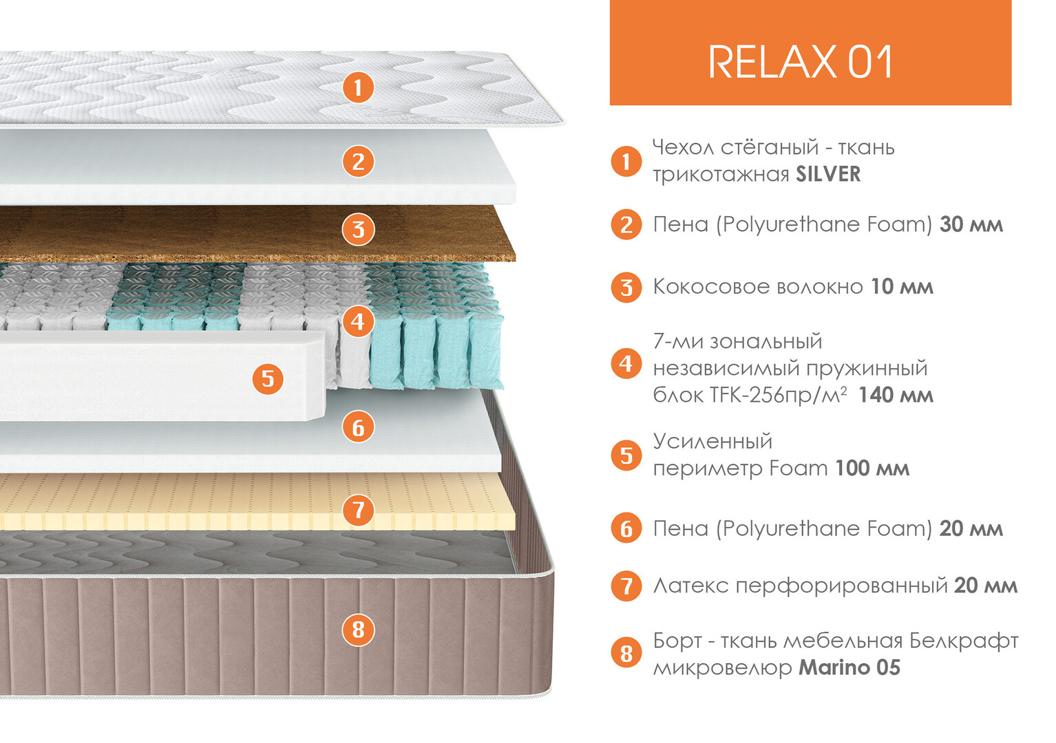 Матрас «Relax01» — ортопедическое изделие для сна и отдыха, изготовлено на основе 7ми зонального блока независимых пружин TFK (256 пружин на м²) для правильной поддержки позвоночника, а также кокосовой койры для жёсткости и пенополиуретана (Orto Soft), добавляющего комфорт. Одна сторона матраса — средней жёсткости, вторая — пенополиуретан и латекс для повышенной комфортности среде мягкая . В модели по всему периметру используется короб из пенополиуретана шириной 100 мм, что повышает прочность и препятствует деформации края боковины.