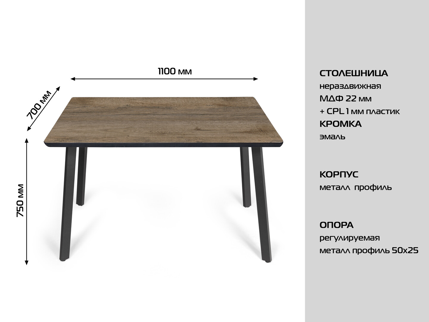 • Ножки: выполнены из прочного металла, окрашены в глубокий чёрный цвет. Оригинальная конструкция с перекрёстным расположением опор придаёт столу современный вид и обеспечивает высокую устойчивость.
