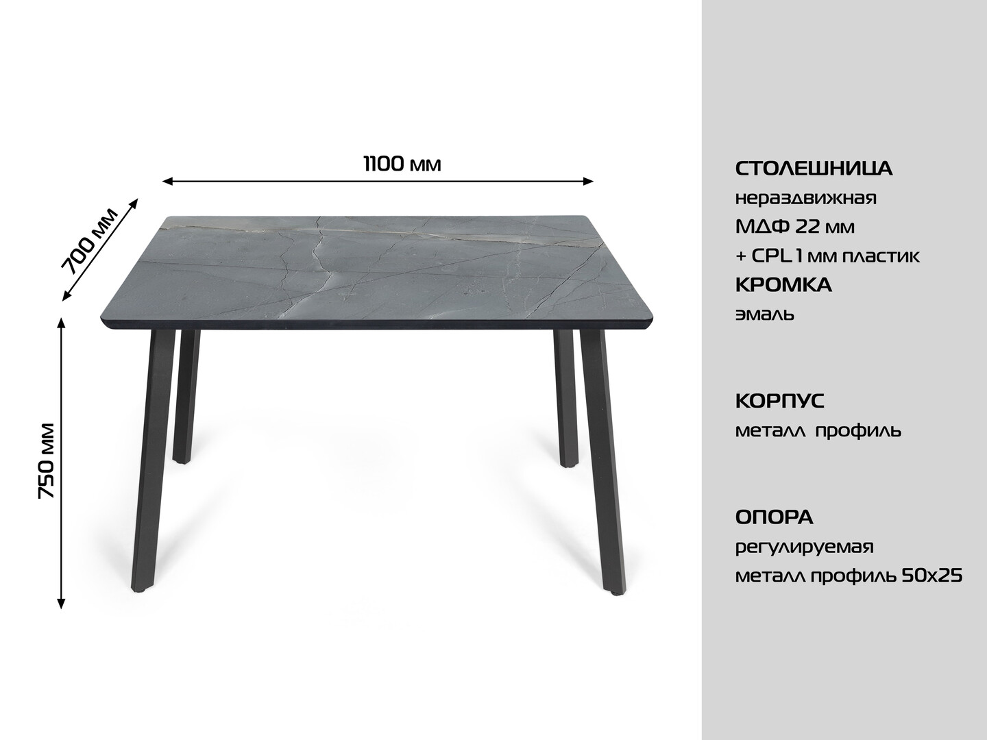 • Ножки: выполнены из прочного металла, окрашены в глубокий чёрный цвет. Оригинальная конструкция с перекрёстным расположением опор придаёт столу современный вид и обеспечивает высокую устойчивость.